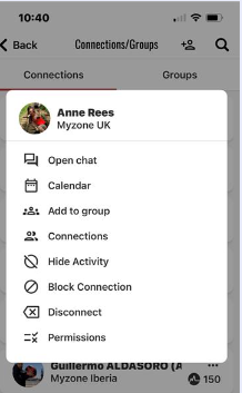 Open the Myzone app, go tap Menu and select Connections. Search for the connection you would like to manage and tap the 3 dots next to their profile. Then tap on Permissions.