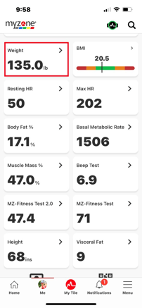 To edit your height and weight from the Myzone app, tap on the Me icon and scroll down to the bottom to view your Body Metrics.