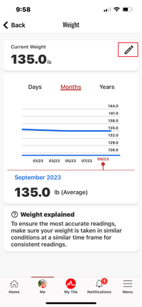 Edit weight and height from the App's 'Me' section.