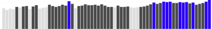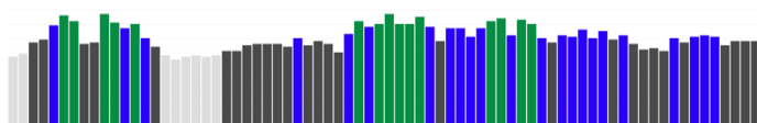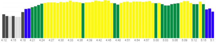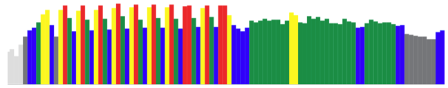 A steady-state cardio workout, such as a bike ride or jog, might have big blocks of one color representing the the sustained effort level, with cooler colors to start end end for the warm up and cool down.