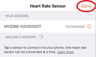 Once Strava finds your device, you will see 'connected' next to your Myzone ID#. Tap done.